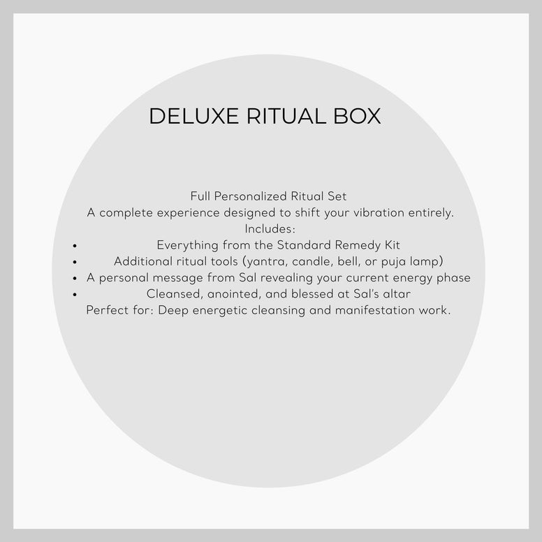 The highest level of spiritual personalization. You’ll meet directly with Sal for a private one-on-one consultation (video or audio) where he reads your chart and prescribes your remedy in real time. Afterward, a custom ritual box is created exclusively for you, cleansed and charged under planetary timing.