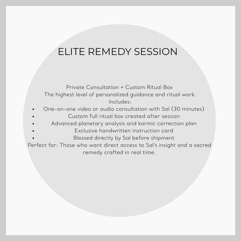 The highest level of spiritual personalization. You’ll meet directly with Sal for a private one-on-one consultation (video or audio) where he reads your chart and prescribes your remedy in real time. Afterward, a custom ritual box is created exclusively for you, cleansed and charged under planetary timing.